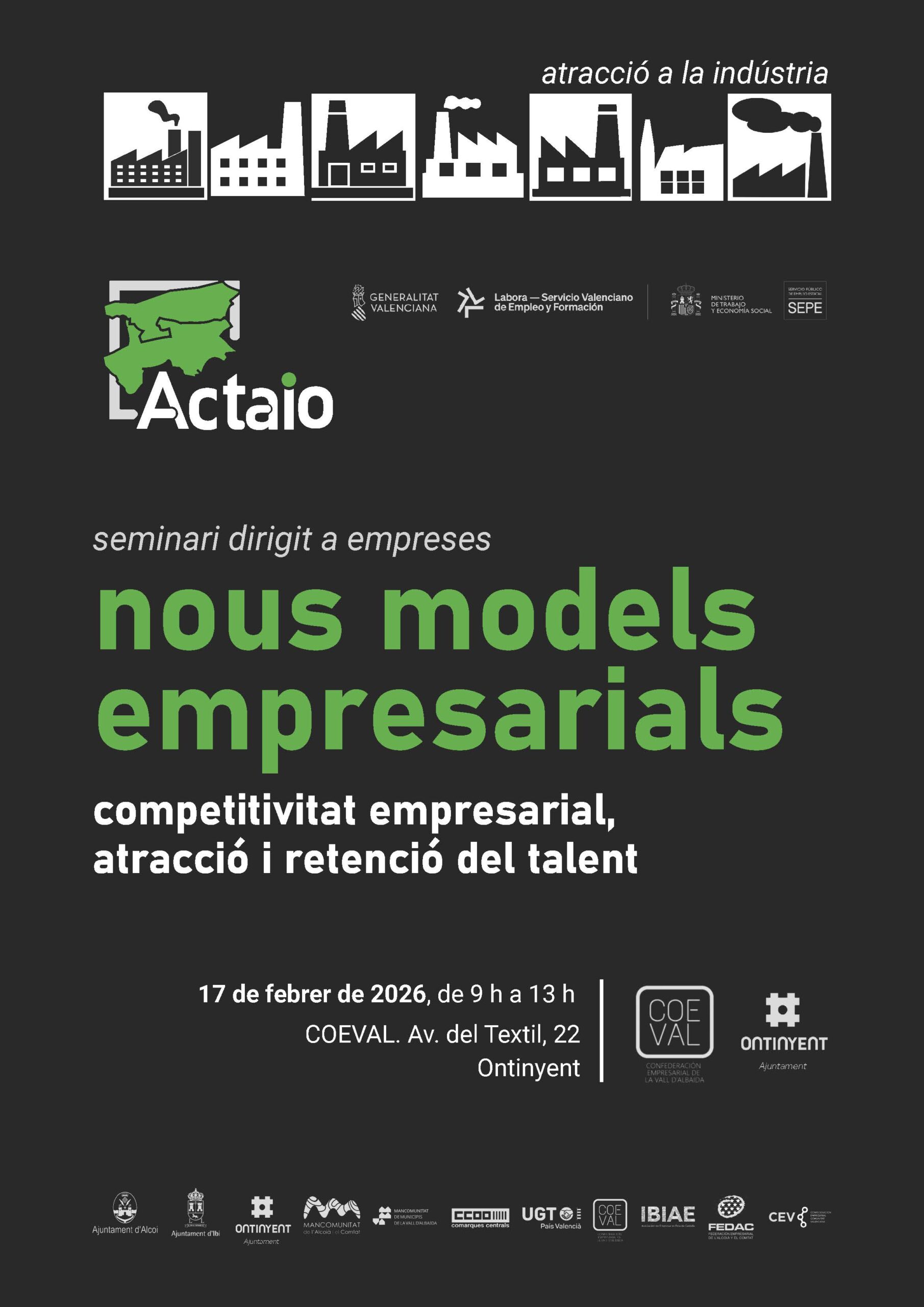 Desde Actaio (el Acuerdo Territorial para el Empleo y el DesarrolloLocal), retomamos el contacto con el sector empresarial de nuestra comarca para informaros e invitaros al Seminario de Nuevos Modelos Empresariales, que tendrá lugar el próximo martes17 de febrero, en la sede de COEVAL (Avda. del Tèxtil, 22 -Ontinyent), en horario de 9.00 a13.00 h.