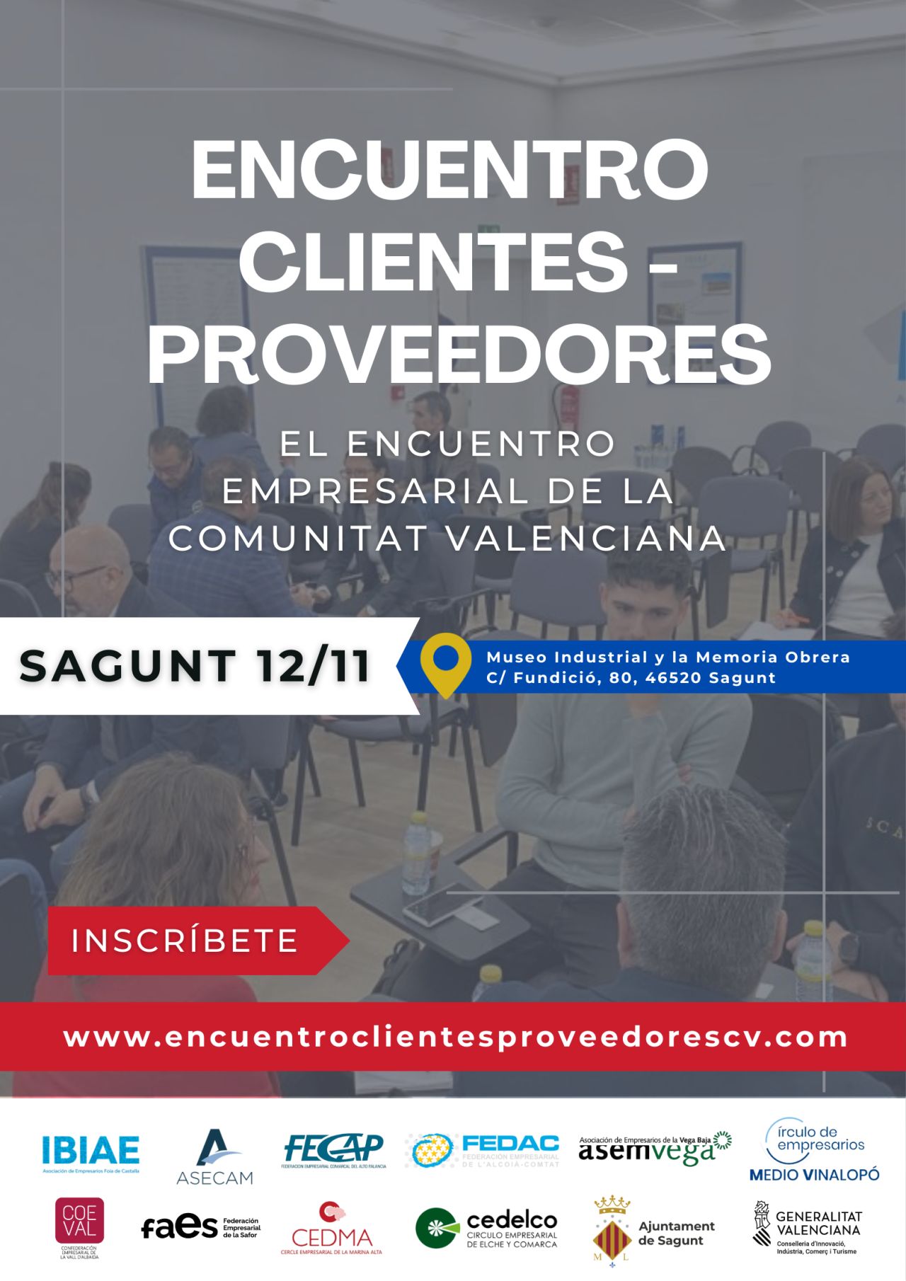 El próximo 12 de noviembre Sagunt acogerá una nueva edición del Encuentro Clientes-Proveedores de la Comunitat Valenciana, en el Museo Industrial y de la Memoria Obrera, en la que participa COEVAL junto a otras Asociaciones Empresariales de la Comunitat Valenciana(ver documento adjunto).