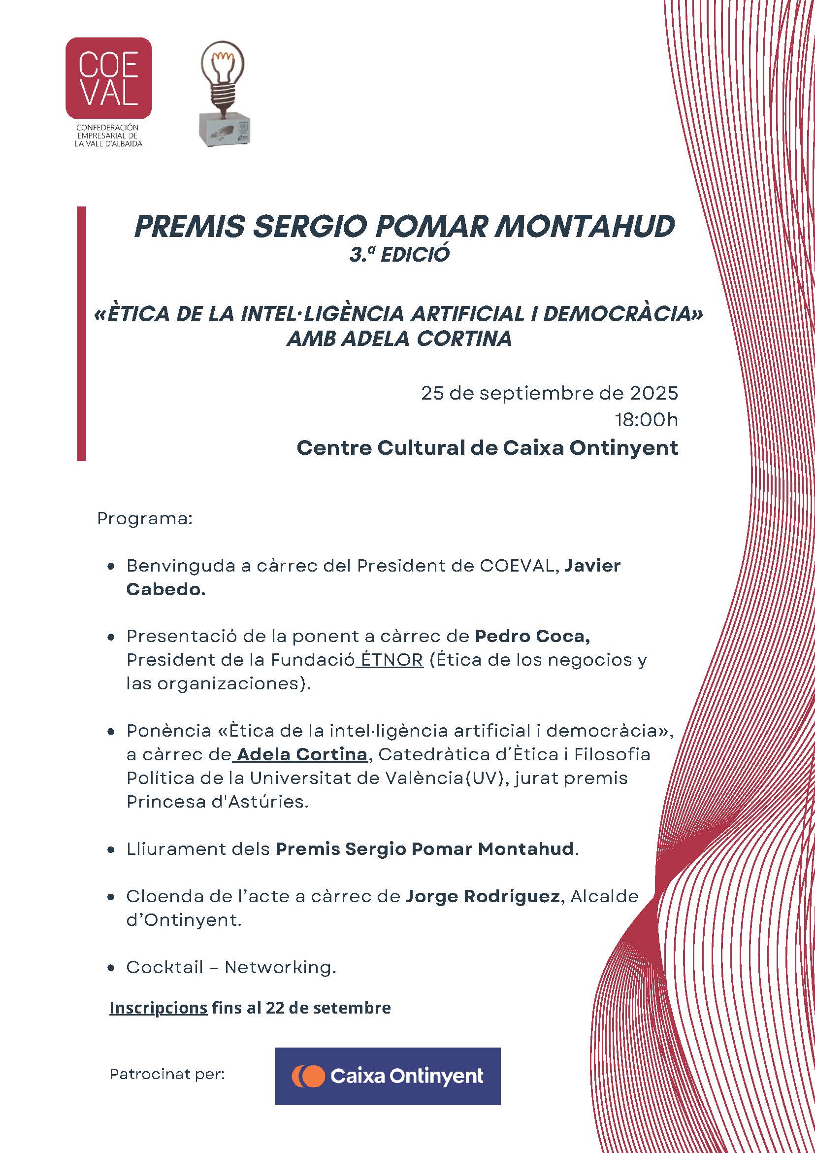 En primer lloc podrem escoltar un autèntic luxe, Adela Cortina, Catedràtica d’Ètica i Filosofia Política de la Universitat de València (UV), amb un gran prestigi nacional i internacional, que ens parlarà d’un tema que realment ens ocupa i preocupa: “Ètica de la intel·ligència artificial i democràcia”. Seguidament es donarà a conèixer el lliurament i farem entrega dels premis a les empreses guardonades en la 3ª Edició dels Premis Sergio Pomar Montahud, patrocinats per CAIXA ONTINYENT. Per últim, podrem gaudir d’un cocktail-networking per compartir diferents temes de manera distesa, a més de seguir construint junts el futur de la nostra Comarca de La Vall d’Albaida.